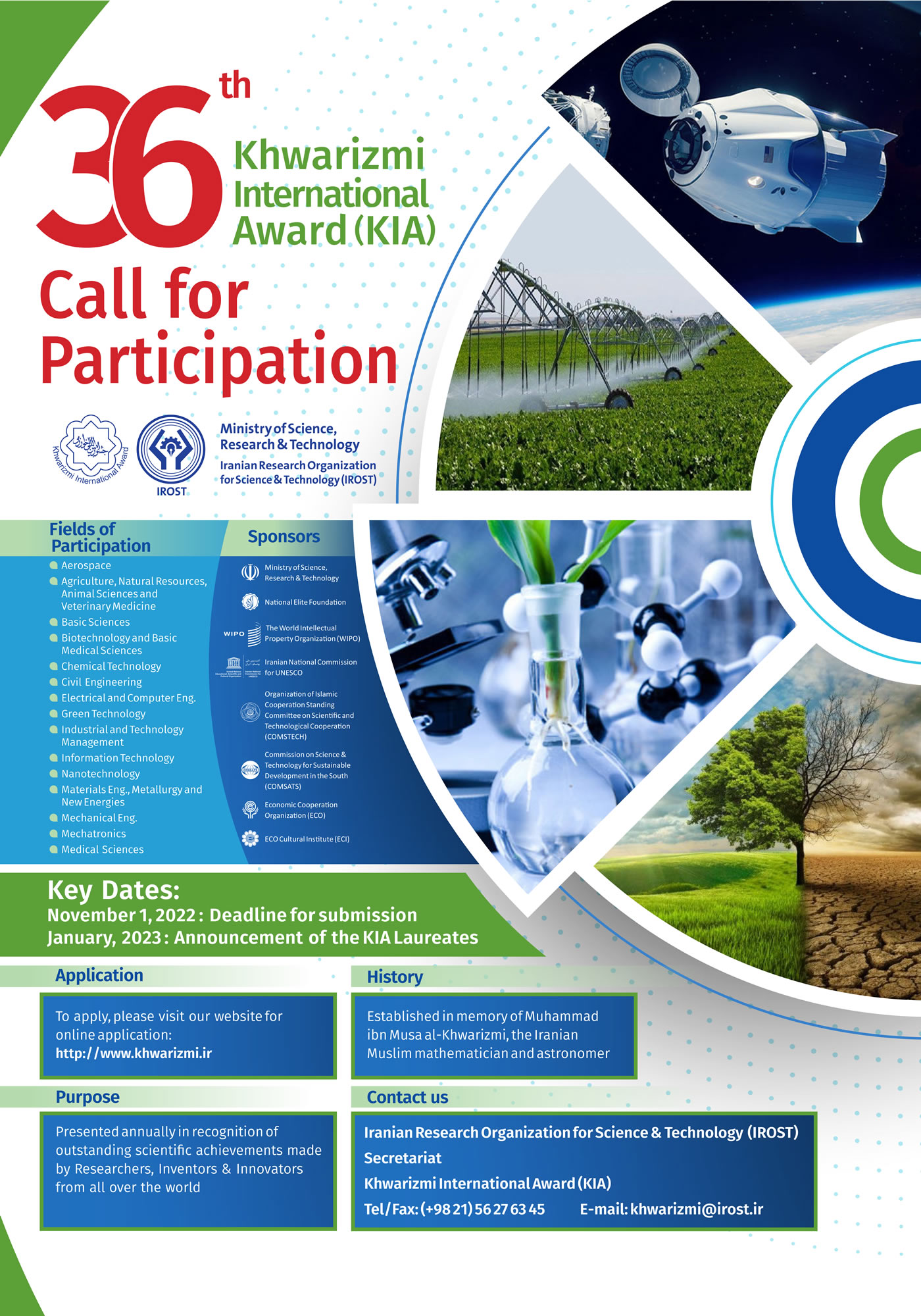 Wissenschaftler und Forscher auf der ganzen Welt sind eingeladen, sich für den 36. Khwarizmi International Award (KIA) zu bewerben. KIA möchte die Bemühungen von Forschern, Innovatoren und Erfindern anerkennen und ihre herausragenden Forschungsarbeiten und Beiträge in verschiedenen Bereichen der Wissenschaft und Technologie würdigen.