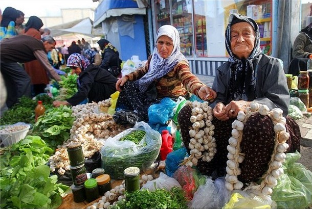 Die Architektur der Karawansereien und der Torbögen zählen zu den touristischen Attraktionen des Basars in Rascht, so auch die vielfältigen Landwirtschaftsprodukte, die auf ansehnliche Weise angeboten werden.