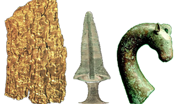 Waffen: Der Schatz enthält auch Waffen aus Bronze und Eisen (zwei Eisen-Schwerter, Pfeil- und Lanzenspitzen), hier wird meist angenommen, dass diese ursprünglich aus der Festung selber stammen. Goldene Ortbänder und aufwendig gestaltete goldene Aufsätze für Schwertgriffe stammen dagegen eher aus dem Hort eines Herrschers. Eines der Ortbänder ist mit der Darstellung eines Panthers verziert.