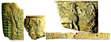 Elfenbein: Die meisten Elfenbeinplatten waren wohl ursprünglich Möbelteile. Solche eingelegten Möbel sind aus assyrischen Reliefs und aus den Königsgräbern von Salamis bekannt. Die Platten stammen aus assyrischen und urartäischen Werkstätten, die in die Zeit von Tiglat-Pileser III. (747-727 v. Chr.) zu datieren sind. Andere Elfenbeinplatten entstammen wohl den Werkstätten von Hasanlu. Einige der Elfenbeinplatten weisen Brandspuren auf, es handelt sich also entweder um Kriegsbeute, oder sie stammen aus der Zitadelle von Ziwiye.