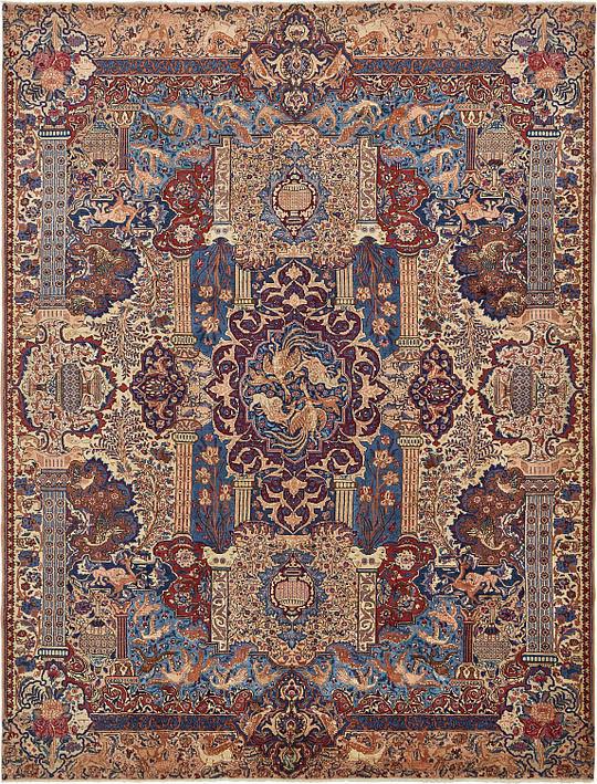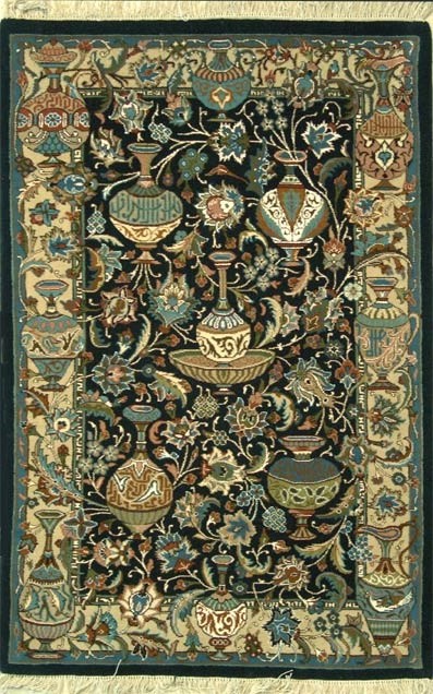 Die Medaillons sind manchmal asymmetrisch und geben Landschaften wieder. Die Knüpfung ist insgesamt voluminös, etwas grobkörnig und der Flor relativ hoch.