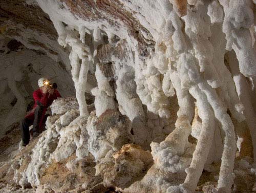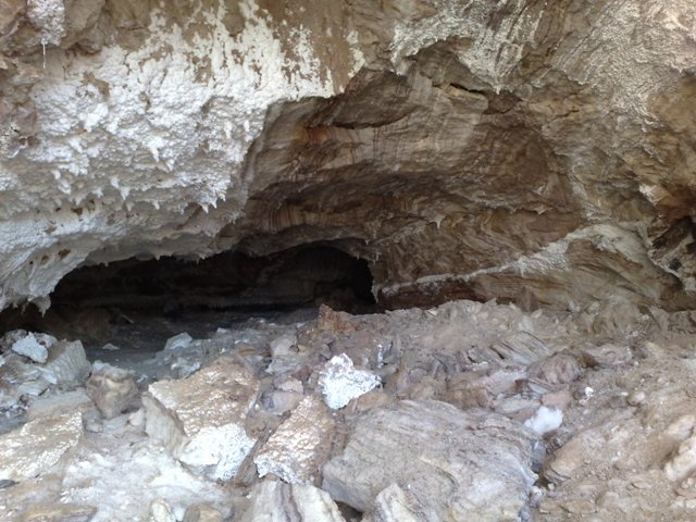 Etwa auf der Mitte des Weges bemerkt man den Höhlenboden, der hier mit Salzkristallen bedeckt ist. An den Wänden verzahnen sich die Stalagtiten und Stalagmiten. Am Höhleneingang befinden sich einige andere Eingänge mit unterschiedlichen Breiten und Höhen.