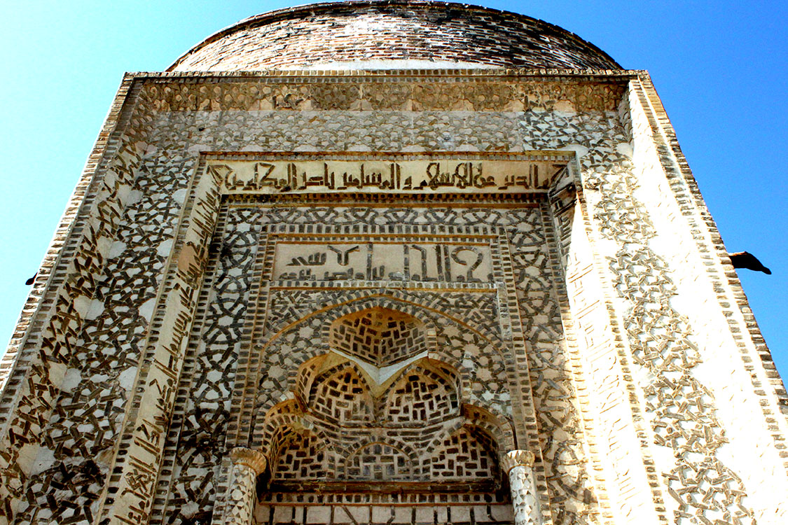 Der Eingang des aus Steinen errichteten Gebäudes wird mit drei Schriften in der Kufischen Schrift verziert, welche auf das Datum Muharram 580 n.d.H. (1180 n.Chr.) verweisen.