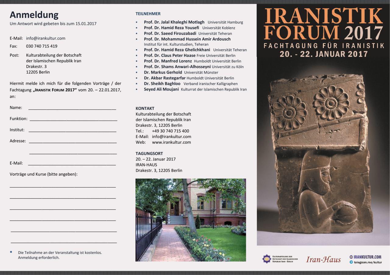 Vom 20. – 22. Januar 2017 lädt der iranischen Kulturrat zur ersten Fachtagung für Studenten, Dozenten und Professoren der persischen Sprache und Literatur und der Iranistik und Orientalistik in Deutschland in das Iran-Haus in Berlin, ein.